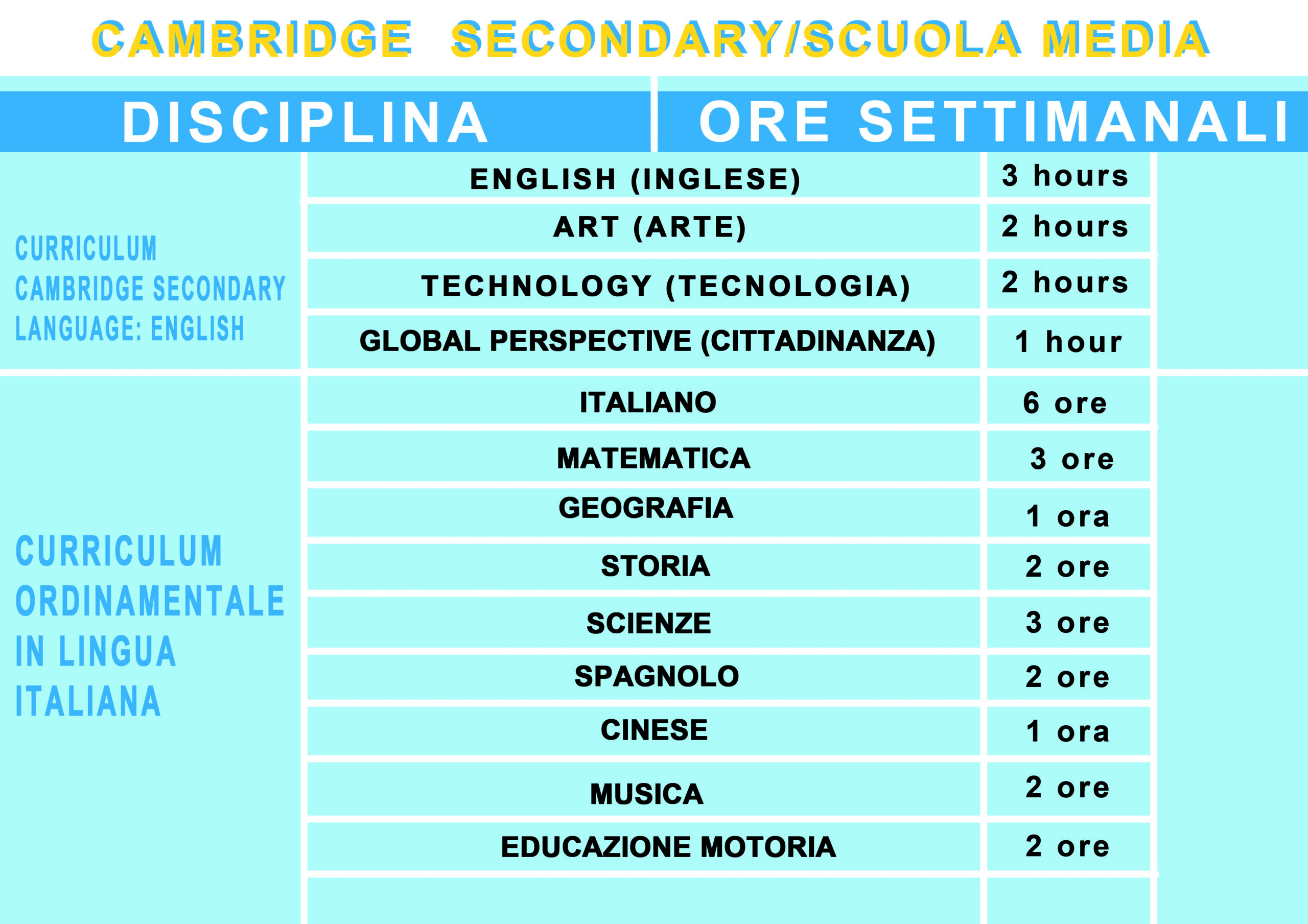 The Cambridge Lower Secondary Curriculum for middle school offers an educational path that integrates the Italian ministerial program, focusing on subjects such as English, Art and Technology, and Global Perspective with an interdisciplinary approach.